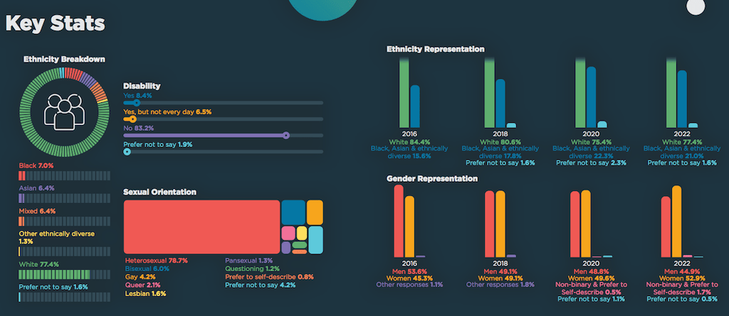 - In entry-level positions, the number of Black, Asian and diverse ethnicity employees fell from 34.6% in 2020 to 23.6% in 2022. At a senior level there was a drop from 19.9% in 2020 to 18.3% in 2022.
